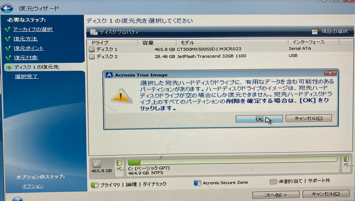 復元先メディアに既にデータが入っている場合、以下の警告が表示されるので上書きして問題なければOKを選択
